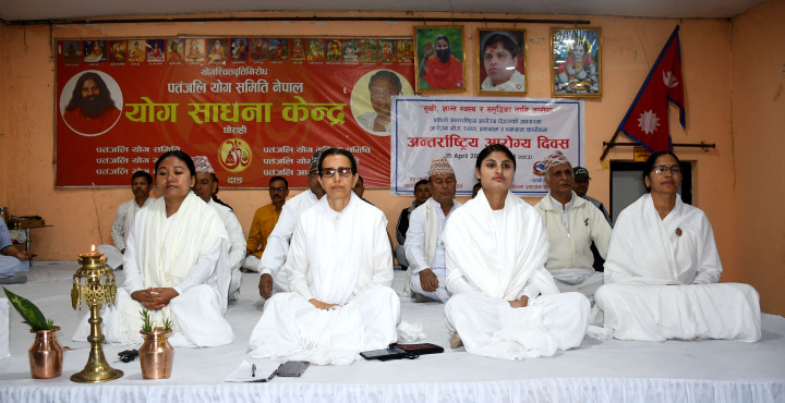 जिल्ला प्रशासन कार्यालय दाङको आयोजनामा अन्तर्राष्ट्रिय आरोग्य दिवसका अवसरमा घोराहीस्थित पतञ्जलि साधना केन्द्र राप्ती योगा हलमा बुधबार आयोजित कार्यक्रममा योग अभ्यास गर्दै साधकहरू।